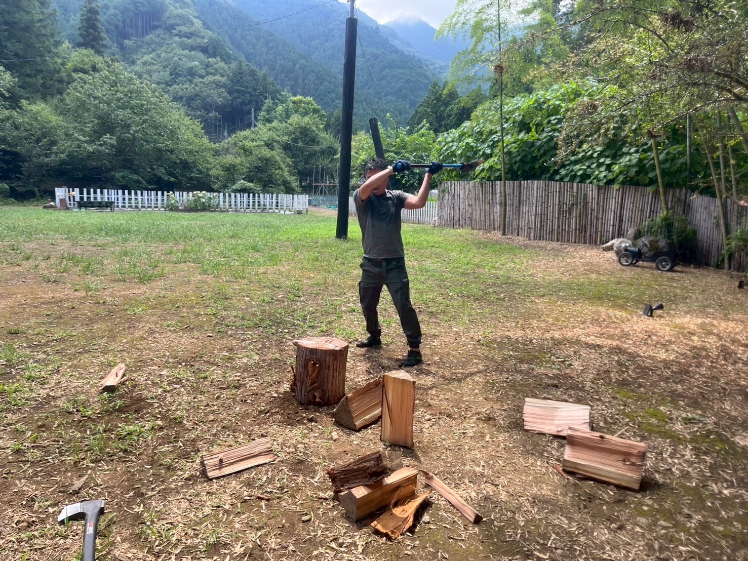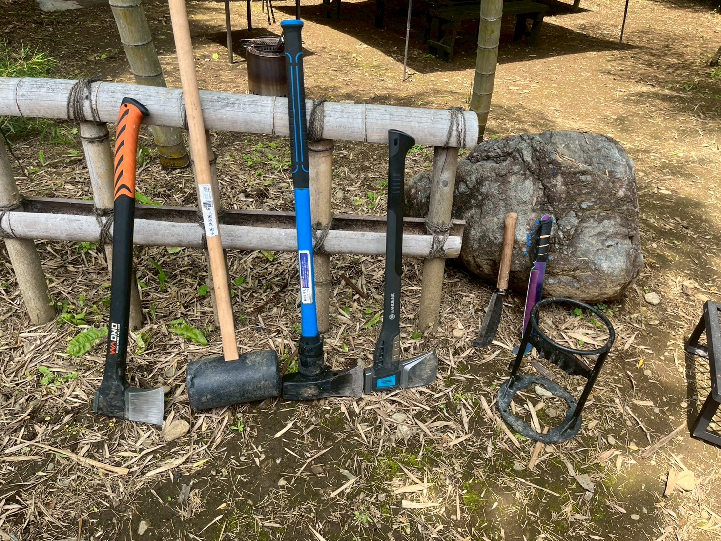 大斧での丸太割りは初体験。徐々にうまく割れるようになって没頭した。次は最初の一振りで真っ二つに割りたい。非日常的な道具を使うのが楽しい。